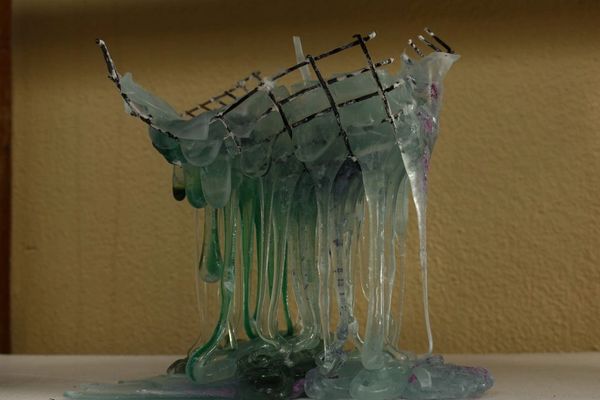 A unique drip ornament which is fitted on a glass plate or alternatively wood. Each product is unique and space is made at the bottom to fit a small LED light.
